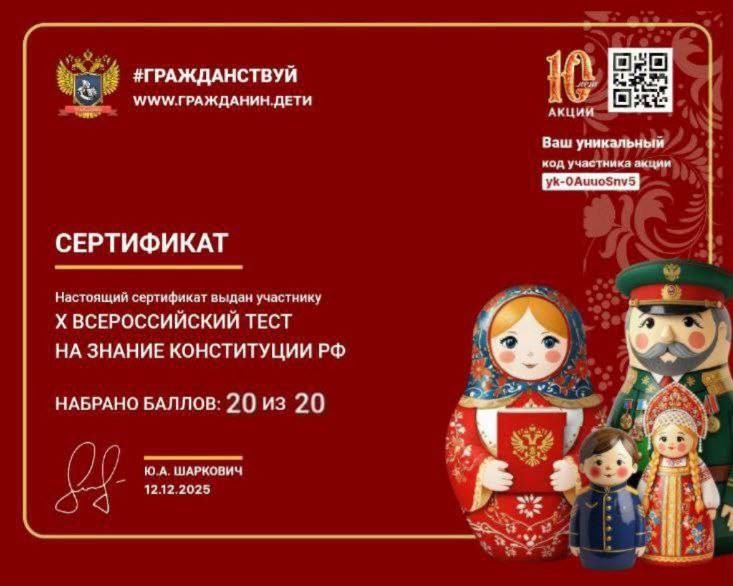 Это была не просто проверка знаний, а важный урок гражданственности и повод всем вместе задуматься об основах нашего государства. Мы убеждены, что знать Конституцию — значит понимать свои возможности и ответственность в обществе. Главная награда для всех участников — тот самый сертификат, который стал символом нашей общей правовой культуры и активной гражданской позиции! Гордимся нашими умными и сознательными учениками! Вместе мы делаем школу пространством не только для учёбы, но и для становления ответственных граждан.